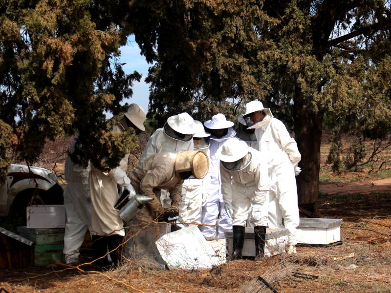 This multi-component apiculture project aimed to build both technical expertise and entrepreneurial capacity. In the initial phase, beneficiaries attended training in Marrakech on agroecology and permaculture, gaining foundational knowledge in apiculture. This was followed by a two-month field mentorship program, during which a professional beekeeper provided one-on-one guidance to families throughout the critical spring season. During this period, the number of hives increased from 60 to 90, and some were enhanced using advanced techniques.